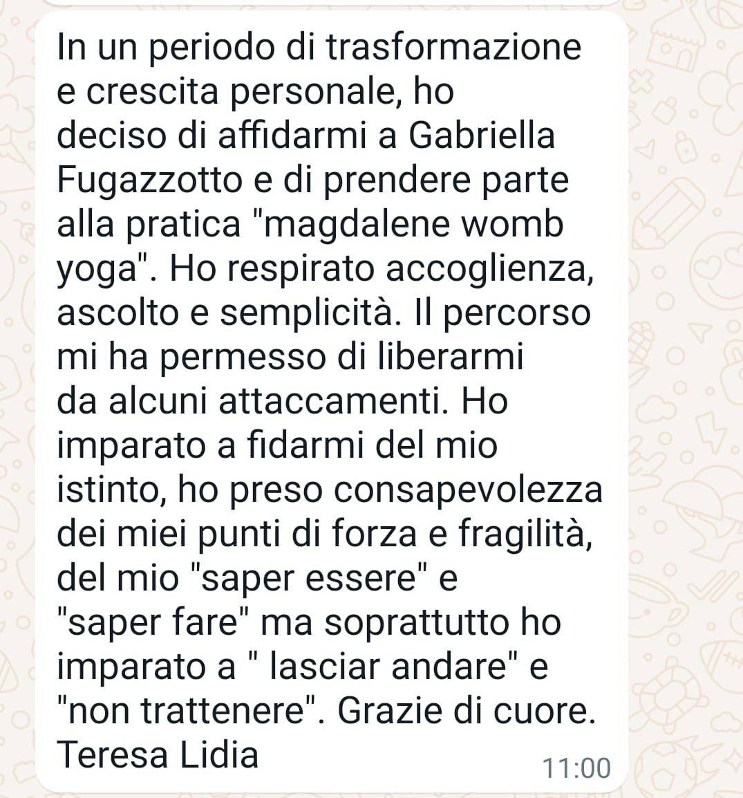 Ho poi scoperto il mondo del Femminile Sacro seguendo vari percorsi di crescita personale e ho così deciso anche di certificarmi Insegnante di Magdalene Womb Yoga® per portare alle Donne i benefici che io stessa ho sperimentato nella mia vita grazie a queste Pratiche.